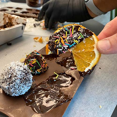 Ellerimizle hazırladığımız Çikolata toplarını çeşit çeşit kuruyemiş, şekerleme ve meyvelerle süslüyoruz. Mis gibi erimiş çikolata kokusu burnunuzda tüterken ekip arkadaşlarınızla beraber bu keyifli etkinliğin tadını çıkaracaksınız.