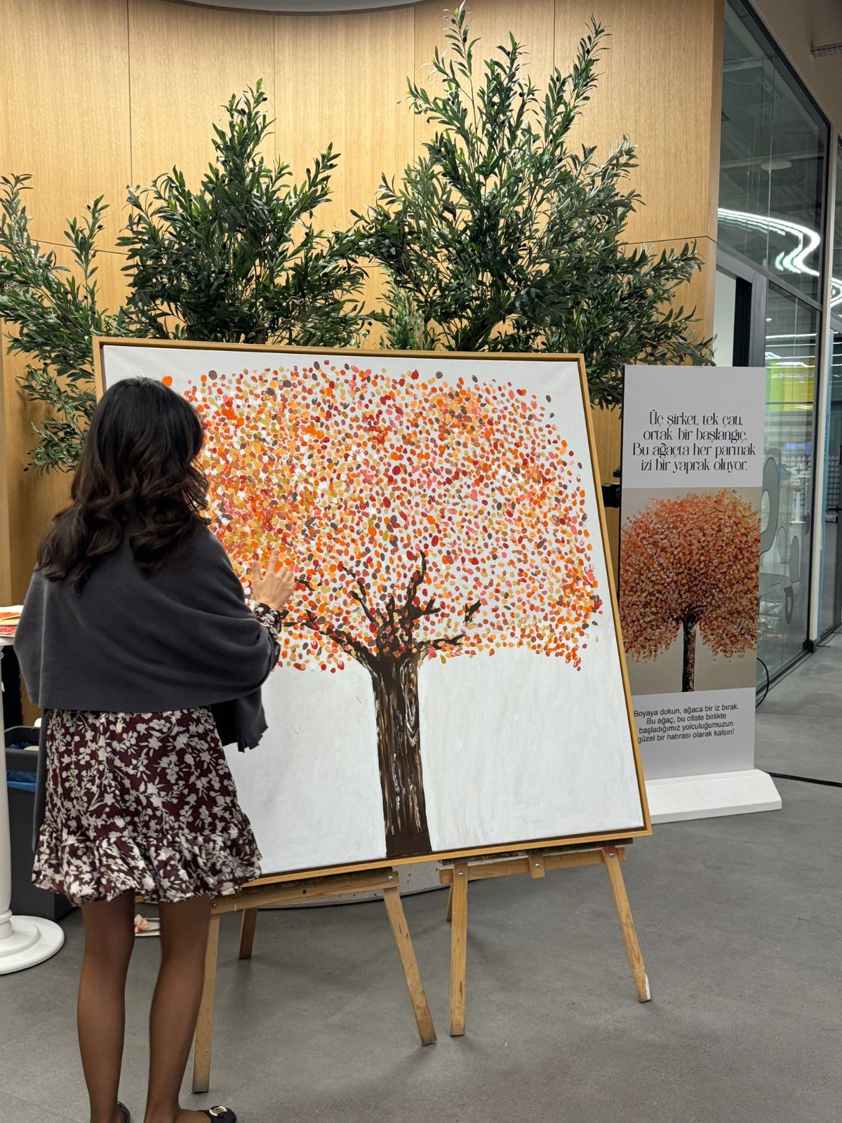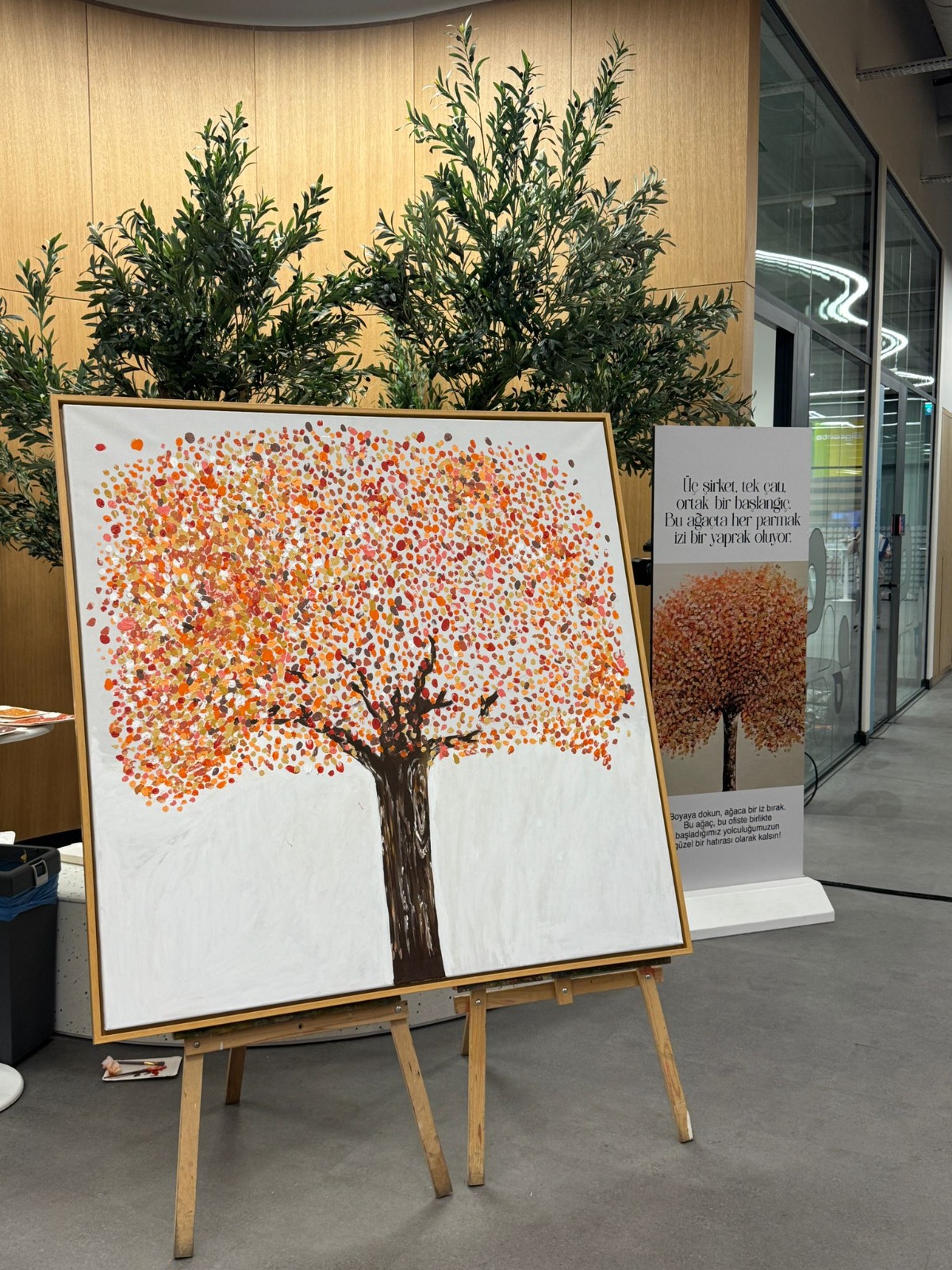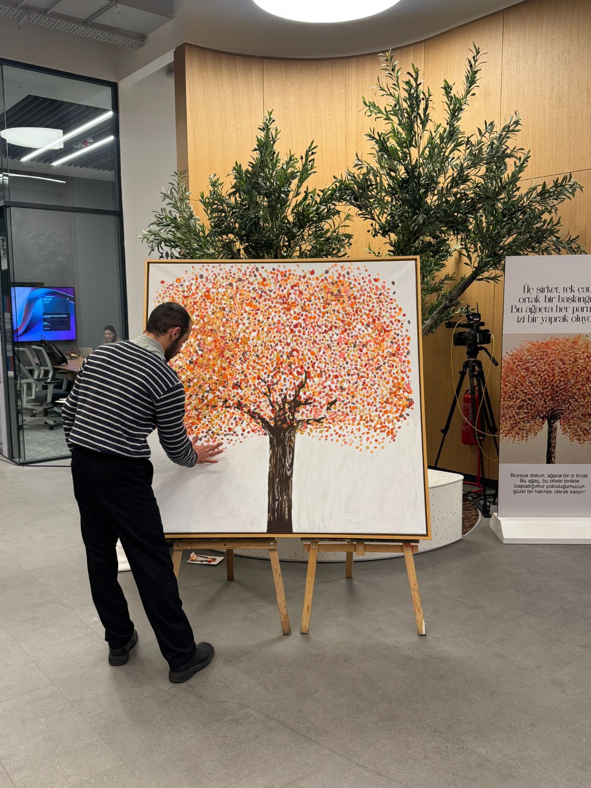 Etkinlik süresince katılımcılar, iş akışlarını bölmeden gün içinde istedikleri an tabloya uğrar, boyaya dokunur ve kendi izlerini bırakır. Tek bir parmak izi ya da kocaman bir el… Her dokunuş, eserin bir parçasına dönüşür. Gün sonunda ortaya çıkan tablo; ekip ruhunu, çeşitliliği ve birlikte üretmenin gücünü görsel olarak yansıtan, tamamen kuruma özel bir sanat eserine dönüşür.