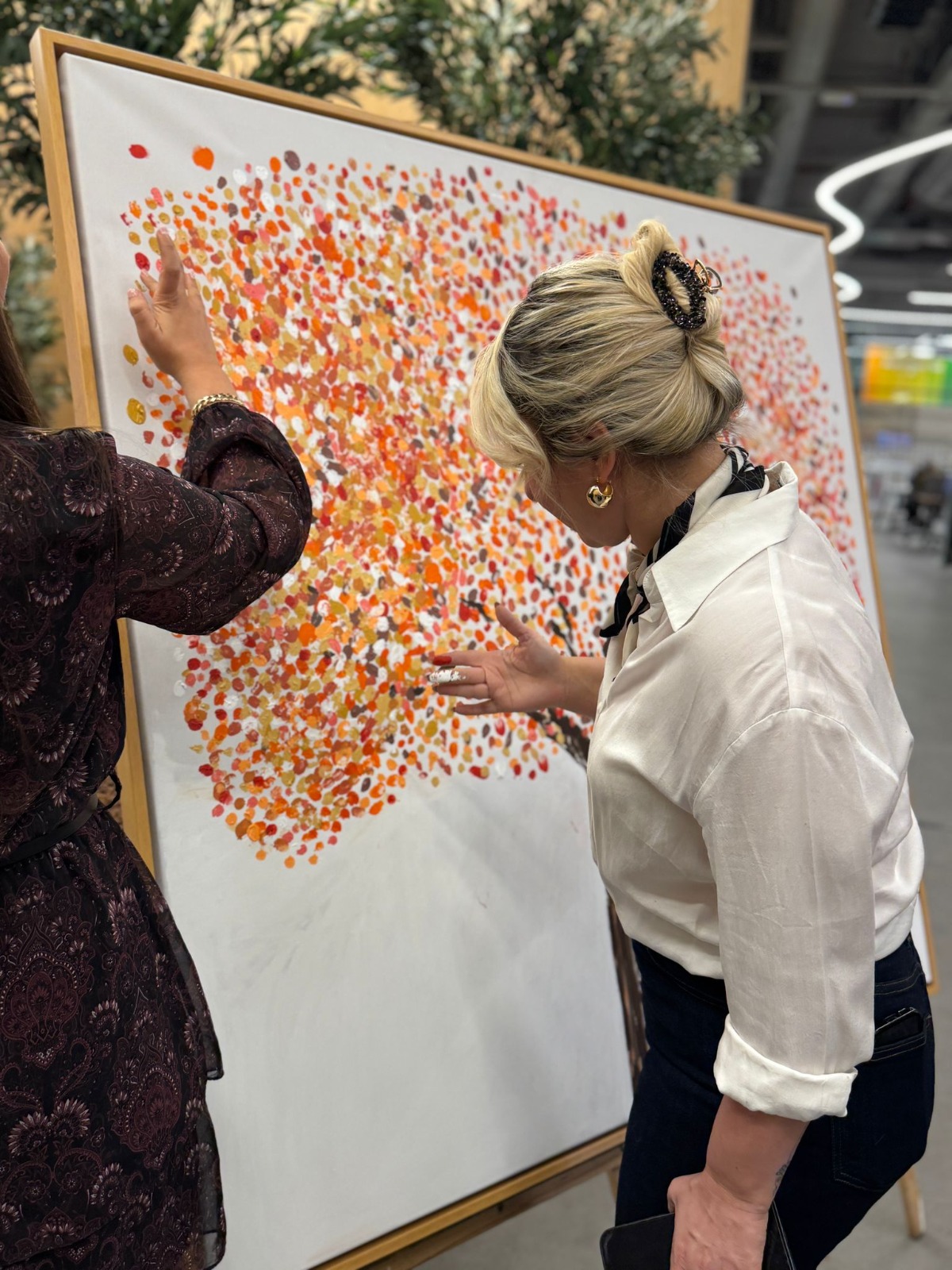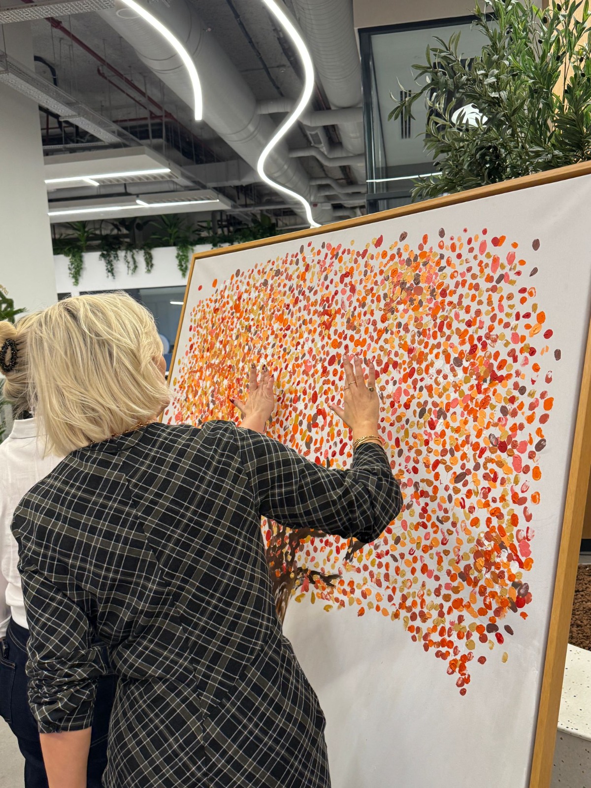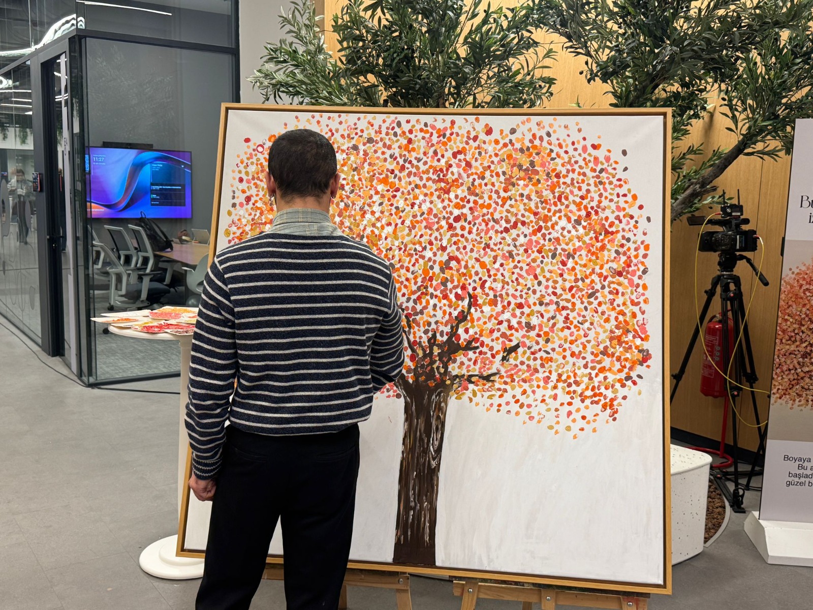 Etkinlik süresince katılımcılar, iş akışlarını bölmeden gün içinde istedikleri an tabloya uğrar, boyaya dokunur ve kendi izlerini bırakır. Tek bir parmak izi ya da kocaman bir el… Her dokunuş, eserin bir parçasına dönüşür. Gün sonunda ortaya çıkan tablo; ekip ruhunu, çeşitliliği ve birlikte üretmenin gücünü görsel olarak yansıtan, tamamen kuruma özel bir sanat eserine dönüşür.