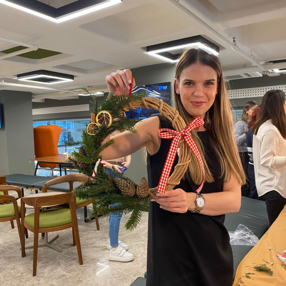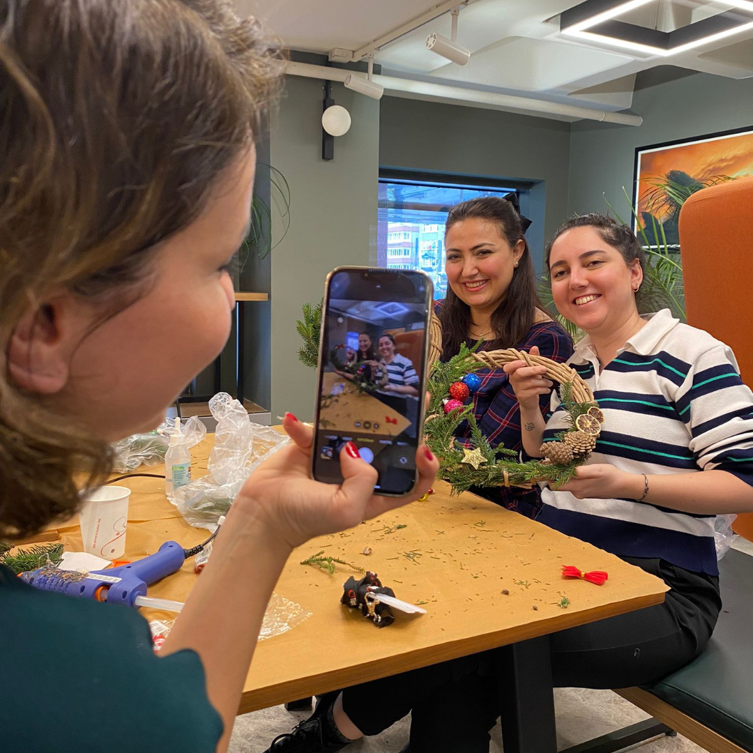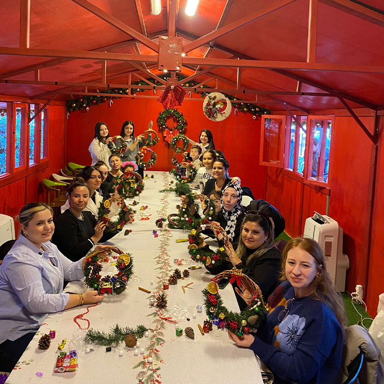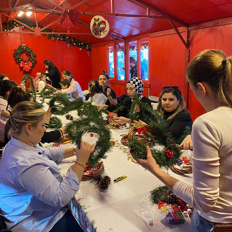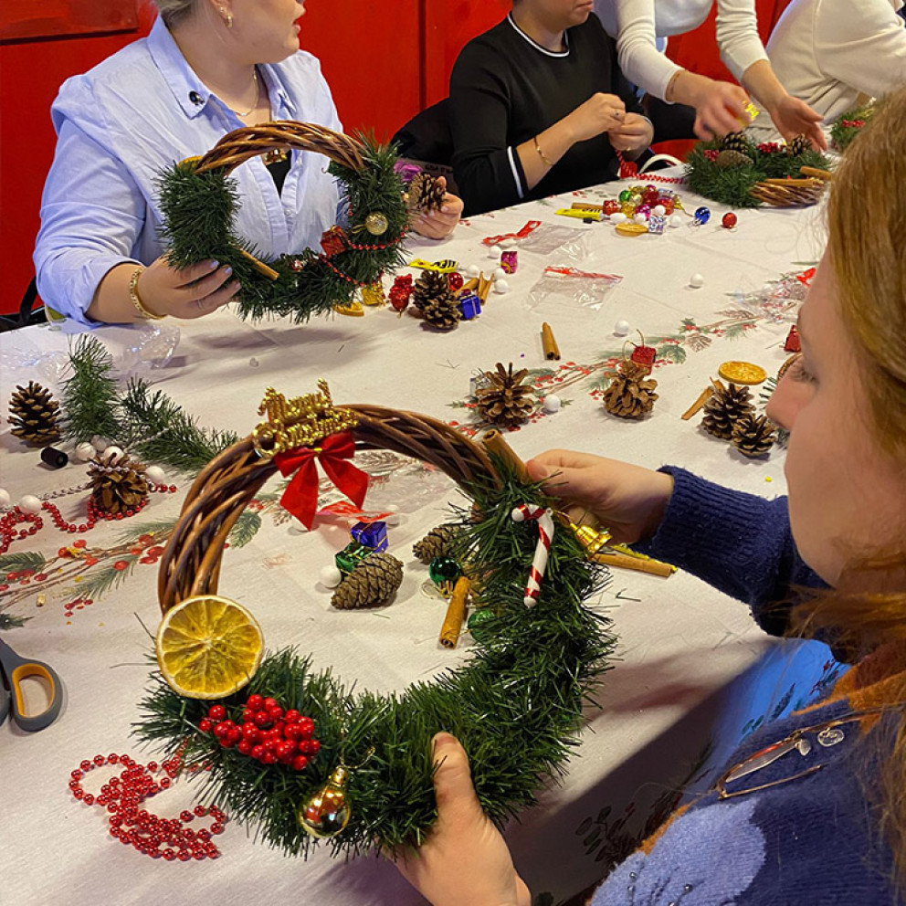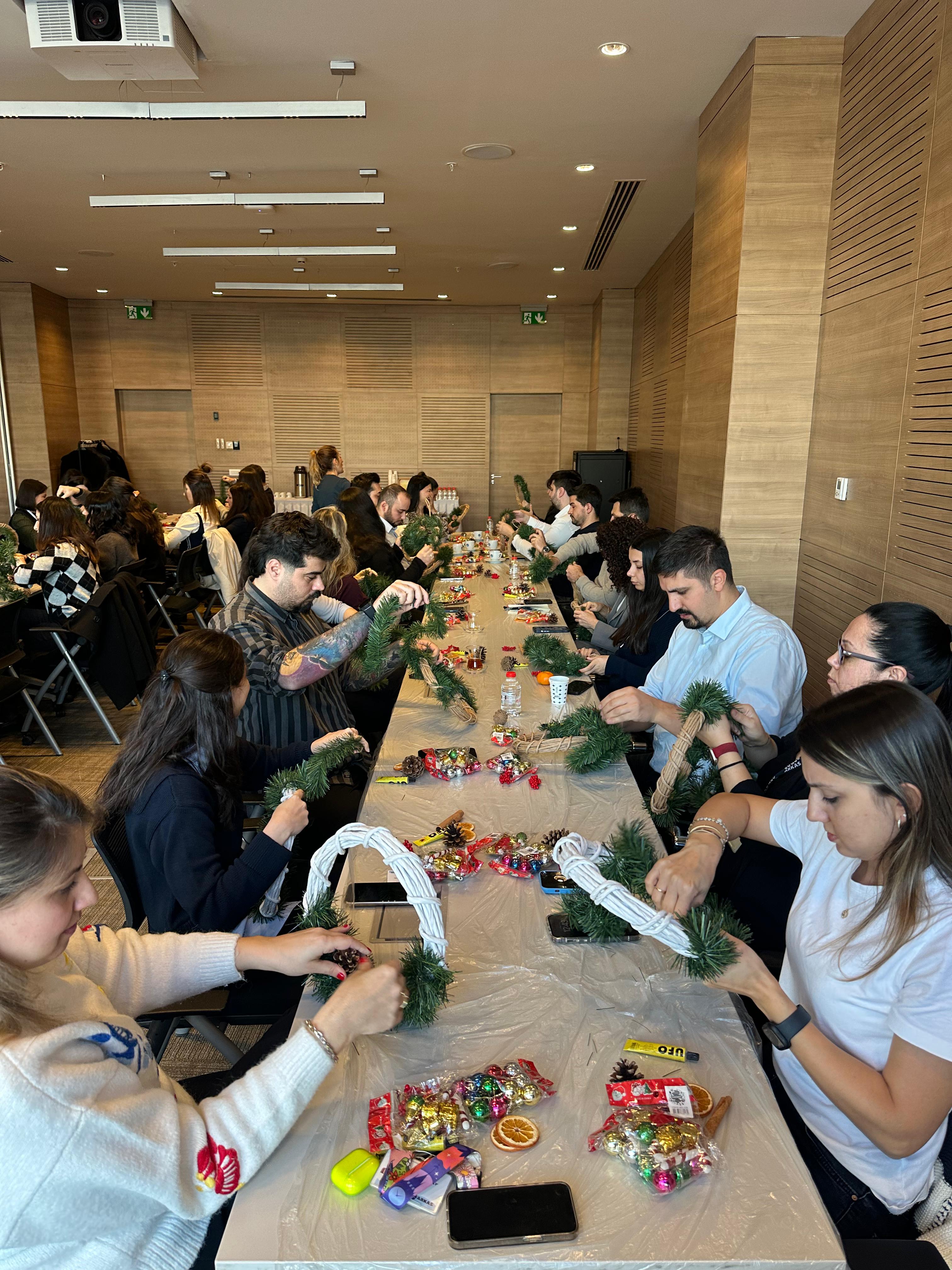 Yılbaşı Kapı Süsü Yapımı Atölyemizde, çalışanlarınız kendi elleriyle kapı süslerini tasarlayarak hem el becerilerini geliştirecek hem de iş yerinde keyifli bir yılbaşı atmosferi oluşturacaklar. Çam dalları, kozalaklar, kurdeleler ve ışıklarla, her katılımcı kendi hayal gücünü yansıtan, sıcacık bir dokunuş katabileceği kapı süsleri tasarlayacak.